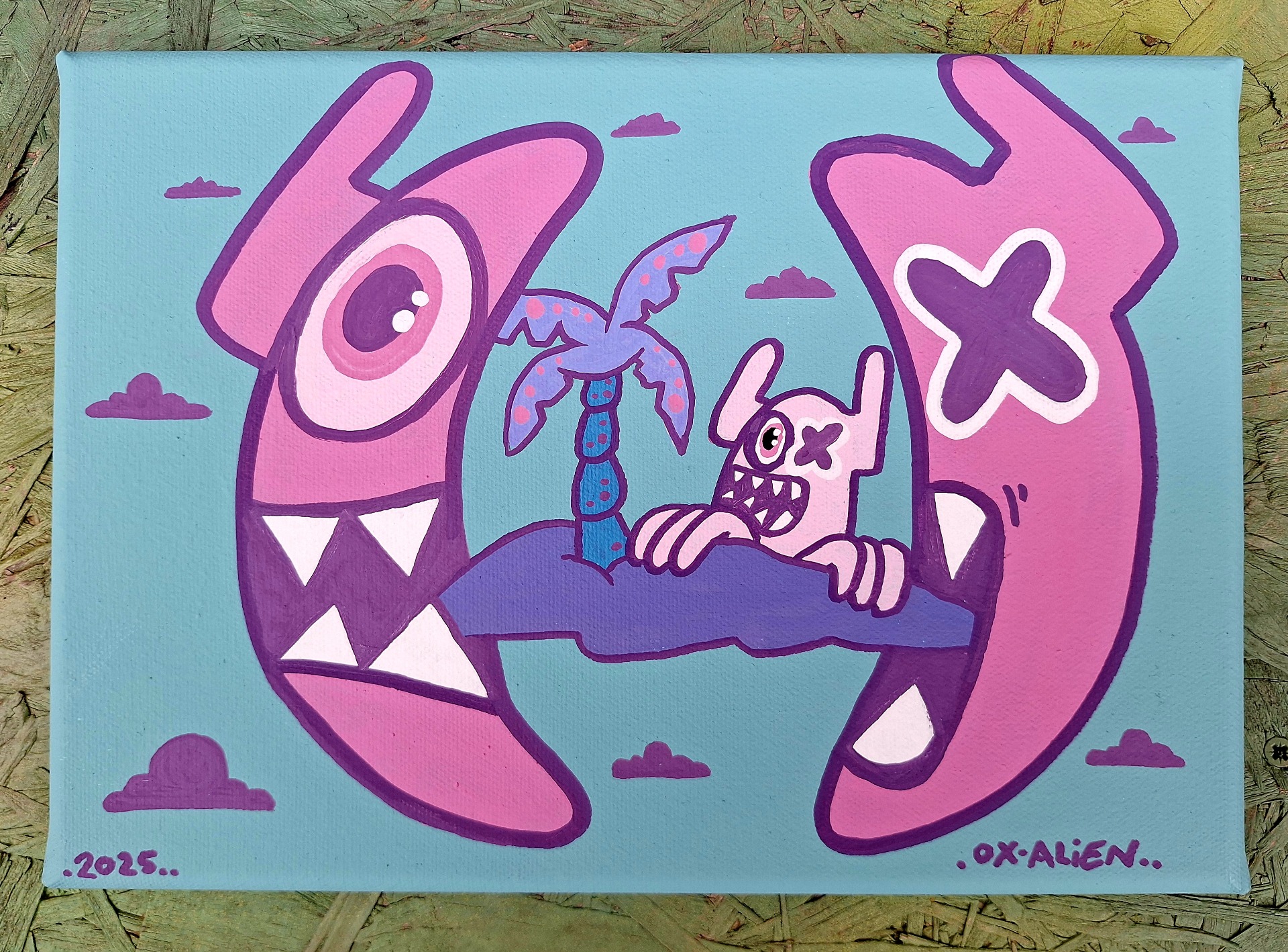 Origineel Ox-Alien schilderij op canvas.